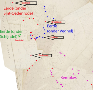 Een kaartfragment (uit MVA2016) over de Eerdse boerderijen onder de verschillende gemeenten rond 1700.