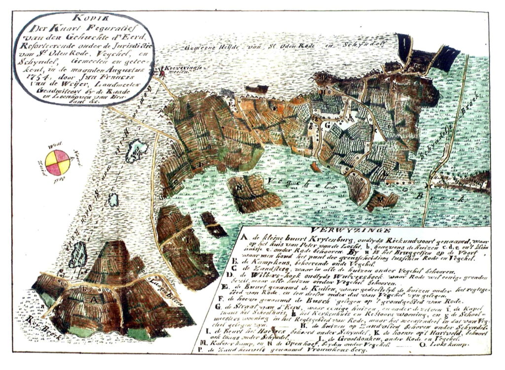 De kaart van den Gehuchte d’ Eerd uit het Brock boek ‘Beschrijving der Vryheid St. Oedenrode’. Op de kaart zijn de locaties weergegeven van de verschillen kroniek-fragmenten die in het boek te vinden zijn. De tekening is een (slordige) kopie, van de kaart van J.F. de Weijer uit 1754.